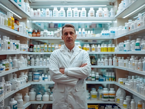 Pharmacist stands confidently in a well-organized pharmacy filled with various medication bottles
