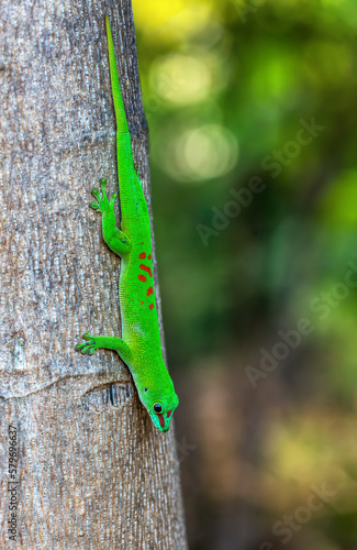 Phelsuma grandis, endemic diurnal arboreal species of day gecko, part of the Phelsuma lizards group. Ankarana Special Reserve, Madagascar wildlife animal