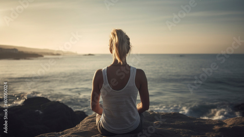 backview, yoga, woman, meditation, sea, mindfulness, pilates, stretching, exercise, wellness, flexibility, balance, harmony, serenity, calmness, relaxation, fitness, healthy lifestyle, female, lady, girl, ladylike, feminine, ocean, seacoast, beach, coastline, shoreline, waterside, waterfront, photo, photograph, nature, summer, meditating, silhouette, sitting, lotus, body, health, outdoors, generative, ai