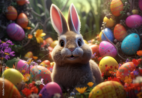 photo happy bunny with many easter eggs on grass festive background for decorative design