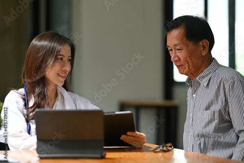 Photo of a beautiful doctor diagnosing and giving advice to the elderly patient at the working desk over a comfortable hospital as background.