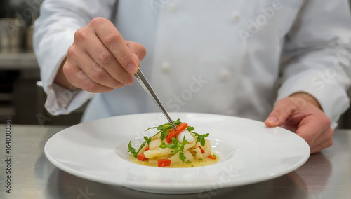 Photo of a chef carefully arranges a gourmet dish on a white plate in a professional kitchen setting for a fine dining experience