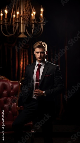 Photo of a handsome businessman in a suit with a dark background, generated by AI