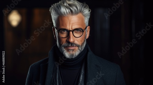Photo of a handsome middle-aged man in stylish clothes and fashionable glasses.