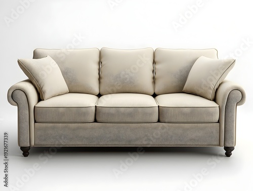 Photo of a light beige cozy sofa in a contemporary living room for furniture advertisement