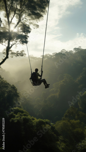 Photo of a man playing zipline through jungle
