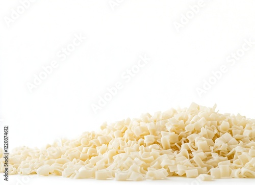 Photo of a pile of instant noodles on a white background, top view with space for text. White color isolated background. Close-up shot of uncooked, undigested, slimy ramen noodle blocks. Photorealisti