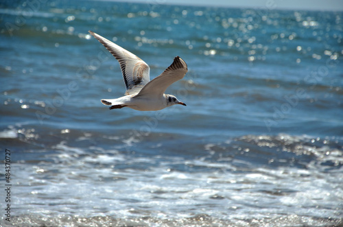 Photo of a seagull in flight close to the sea waves in sunny summer day.
