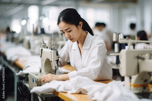 Photo of asian seamstress in textile factory sewing with industrial sewing machines