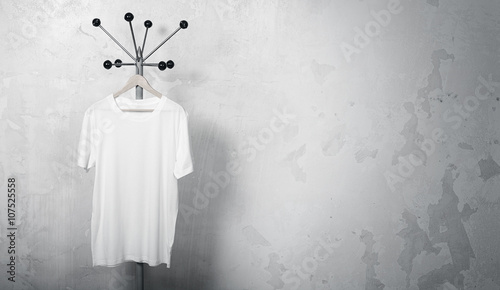 Photo of blank white sweatshirt hanging on the hanger. Empty concrete wall background. Space for your business information. Wide mockup