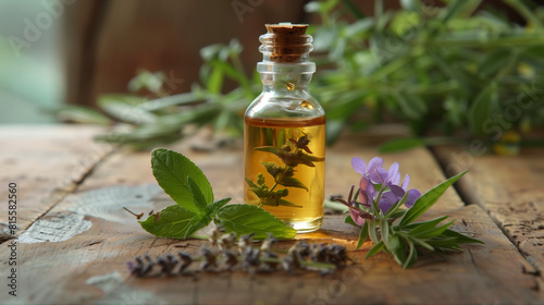 bottle, essential oil, wooden table, rustic, display, simple, functional, warm tones, herb, aromatherapy, organic, health, wellness, beauty, home decor, lifestyle, alternative medicine, relaxation, mindfulness, purity, holistic, therapeutic, aromatic, fragrance, well-being, calm, soothing, interior design, aroma, traditional, glass bottle, handcraft, minimalist