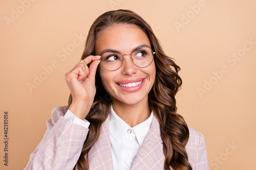 Photo of charming positive lady hand touch glasses look interested empty space isolated on beige color background