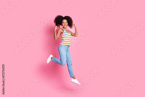 Photo of cheerful lovely cute girl wear trendy summer print clothes isolated on blue color background