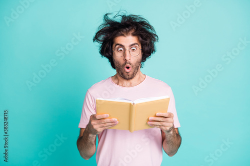 Photo of confused person arms hold book read scary story open mouth isolated on turquoise color background