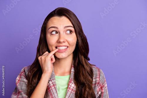 Photo of curious young nervous woman look empty space bite teeth nail isolated on violet color background