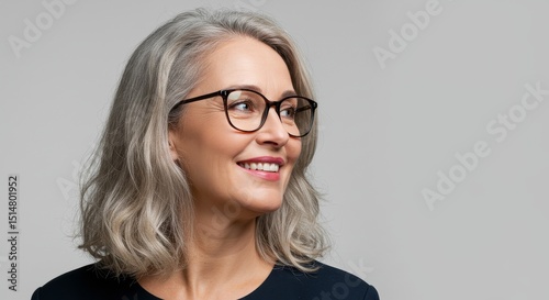 Photo of Elegant Mature Woman with Gray Hair and Glasses Smiling