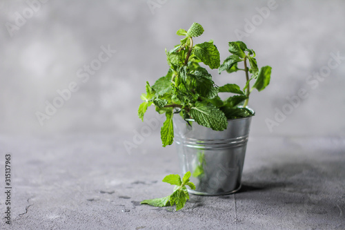 Photo of fresh mint in a pot. Peppermint plants in a pot. Fresh mint growing in a flowerpot. Herb. Still life photography. Image