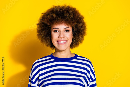 Photo of nice young girl beaming smile empty space wear striped shirt isolated on yellow color background