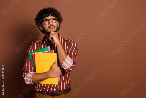 Photo of nice young man minded look empty space wear striped shirt isolated on brown color background