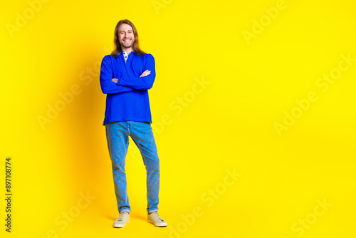 Photo of positive handsome man wear trendy blue pullover empty space isolated on yellow color background