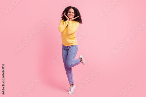 Photo of pretty sweet dark skin girl dressed yellow pullover walking arms cheeks smiling isolated pink color background