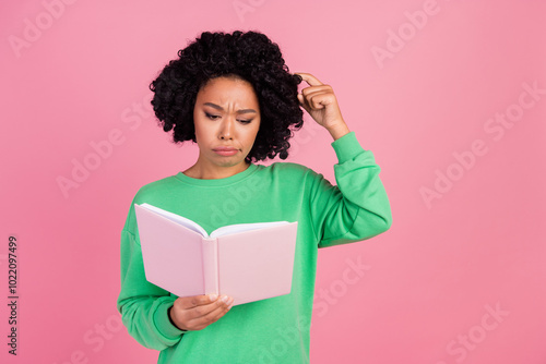 Photo of smart woman scratching head thoughtful wear green sweatshirt holding materials to prepare for exam isolated on pink color background