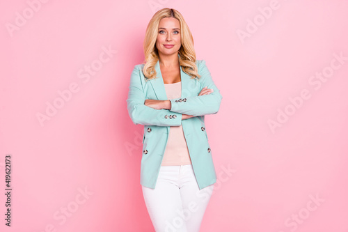 Photo of young happy charming beautiful confident businesswoman with crossed arms isolated on pink color background