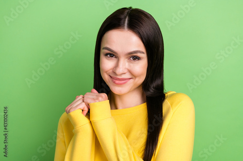 Photo portrait of pretty brunette in yellow clothes cute smiling isolated on vivid green color background