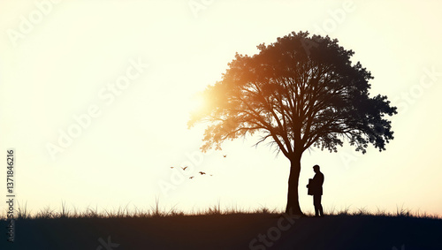Photo Realistic Double Exposure: Silhouette of a Person and Tree Symbolizing Personal Growth and Nature with Ample Copy Space for Text