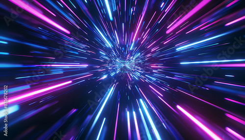 Photo realistic image of neon blue and purple light streaks creating a hyper-speed warp effect, radiating from the center in space