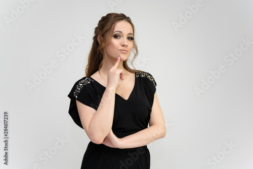 Photo waist-length portrait of a pretty brunette woman girl with long beautiful curly hair on a white background in a black dress. Talking in different poses. Standing facing the camera.