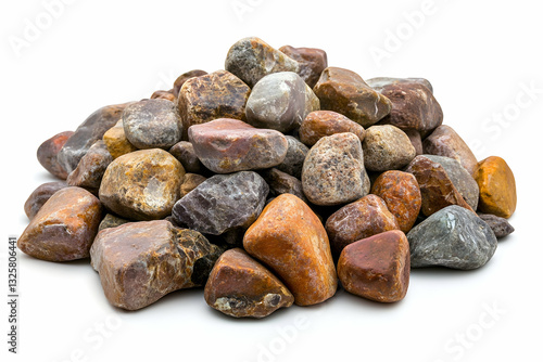 Photograph of a pile or cairn made from smooth rocks on a white background.