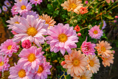 Photograph of colorful flowers planted on land at a beautiful morning at a dew-filled sunrise.