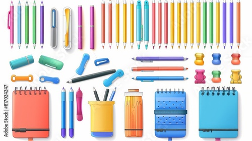 photograph of Pens, colored pencils, erasers, rulers, notebooks, 3d vector cartoon icon set