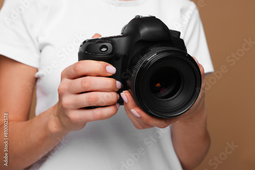 Photographer with camera on brown background, closeup