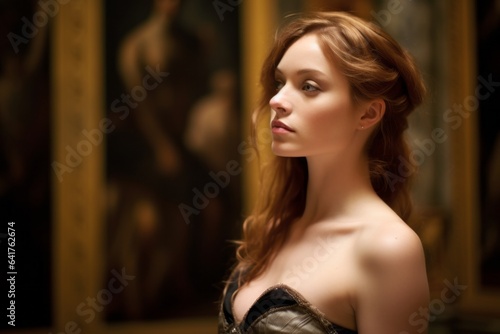 Photography in the style of pensive portraiture of a glad girl in her 40s wearing an elegant corset at the uffizi gallery in florence italy. With generative AI technology
