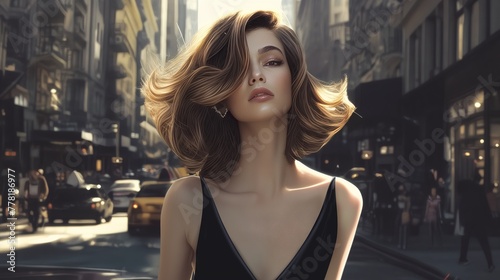 photography portrait of beautiful woman , stylish hair, background a New York street, in the style of George created by ai