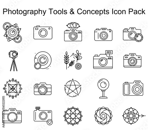 camera, photo, icon, tool, concept, line art, design, graphic, vector, illustration, tripod, lens, flash, digital, print, modern, creative, simple, outline, flat, set, collection, web, app, poster