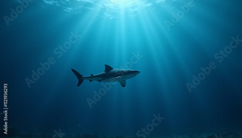 swimming, photorealistic, underwater, deep blue, gradient, ocean, light rays, alone, aquatic, marin, water, minimal, composition, sea, fish, creature, nature, wildlife, solitary, oceanic, peaceful, serene, elegant, vibrant, marine life, calmness, minimalism, realistic, sunlight, depth, simplicity, calm sea