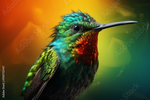 Photorealistic Hummingbird with Glistening Feathers on Green"