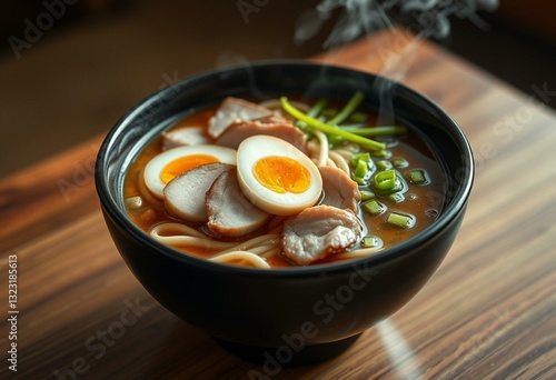 Photorealistic image of a steaming hot bowl of Ramen noodles