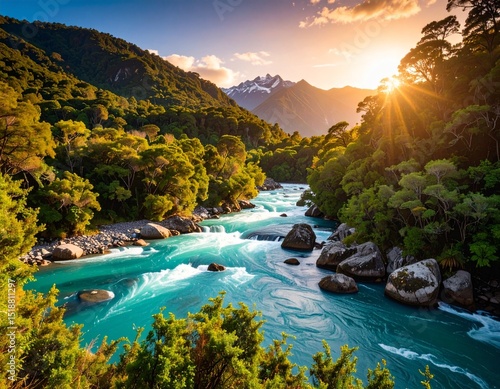 Photorealistic landscape of a New Zealand river at sunset
