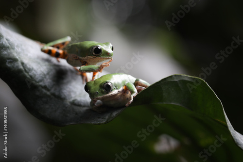 Phyllomedusa hypochondrialis climbing on leaves, Northern orange-legged leaf frog or tiger-legged monkey frog closeup on leaves
