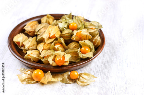 Physalis on a clay dish. Ripe berries of autumn physalis fruit
