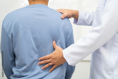 Physical therapy, Asian therapist doctor treat perform pain young man in hospital.