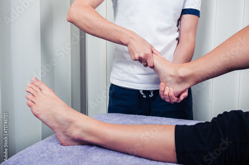 clinic, doctor, exam, foot, health, indoor, physical, physical therapist, physical therapy, practitioner, healer, therapy, woman, young, adult, caucasian, consultation, examining, female, health care, injury, leg, massage, massaging, medicine, muscle, office, patient, rehabilitation, room, specialist, sport, stretching, treatment