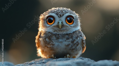 Pichón de búho pequeñito, con grandes ojos tiernos de bebé llenos de admiración y astucia.