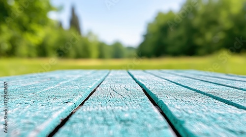 Picnic table in a sunny park, green trees background; product display