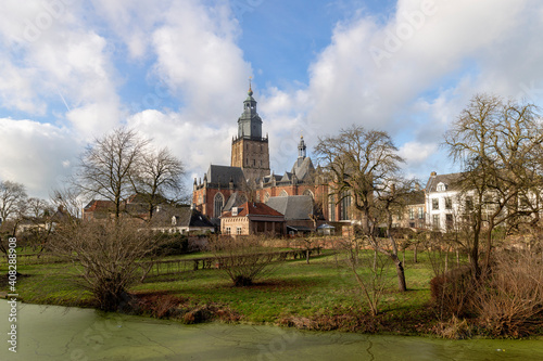 Picturesque cityscape of medieval Hanseatic city Zutphen in The Netherlands with the Walburgiskerk church tower and historic housing surrounding it against a blue sky with clouds