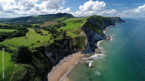 Picturesque Coastline Aerial View of Lush Green Cliffs Meeting the Turquoise Ocean Under Bright Cloudy Sky in Sunlight